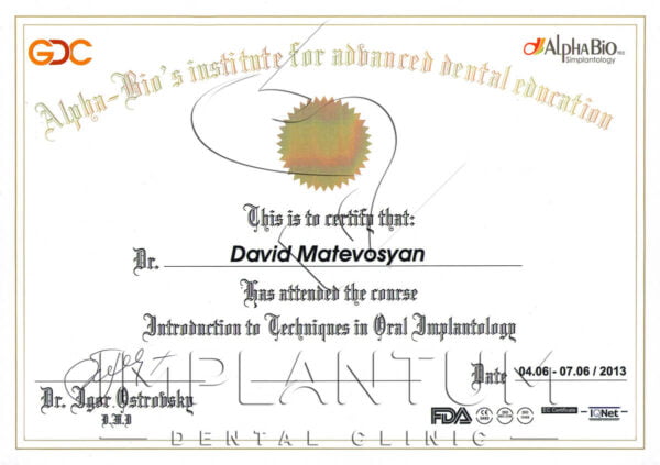 - 2012 — Certificate of Completion: Course in Microscopic Endodontics Management, Clinic of Santiago Di Natale